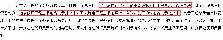《2018年工作要點(diǎn)》指出:推進(jìn)工程總承包,出臺(tái)房屋建筑和市政基礎(chǔ)設(shè)施項(xiàng)目工程總承包管理辦法。