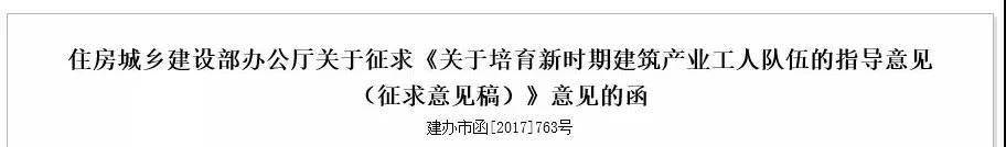2017年11月,住建部印發(fā)關于《關于培育新時期建筑產業(yè)工人隊伍的指導意見(征求意見稿)》(建辦市函[2017]763號)。